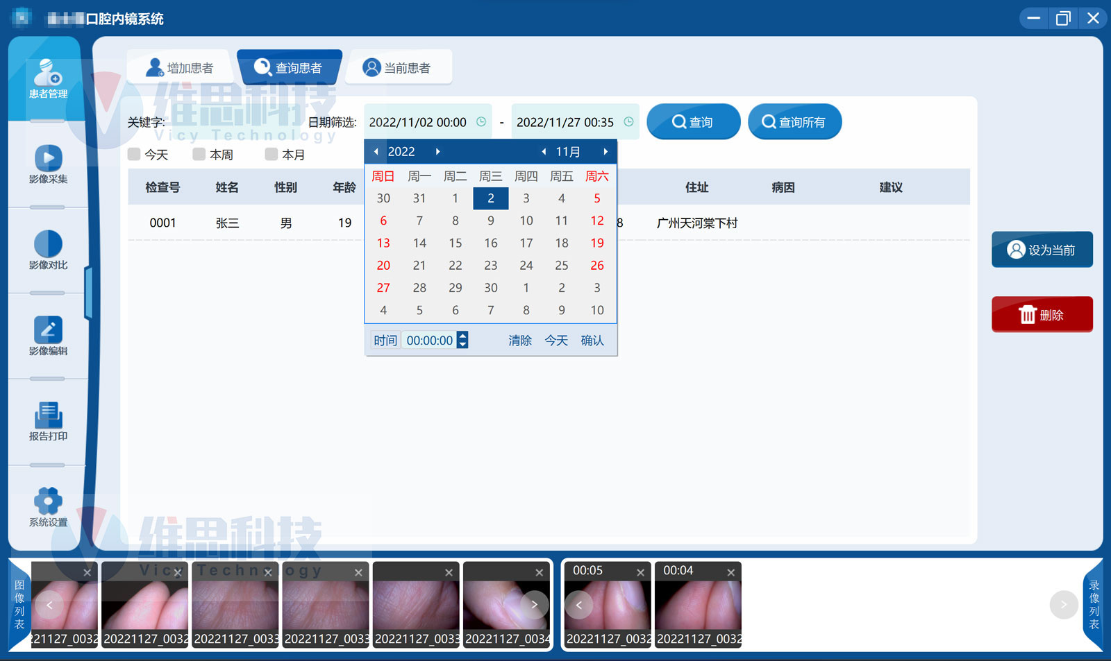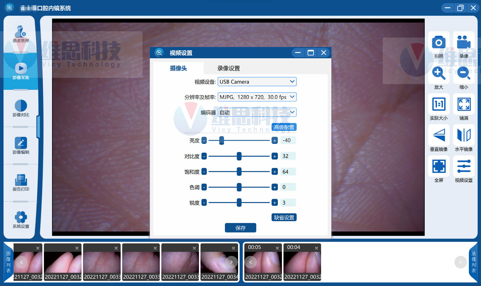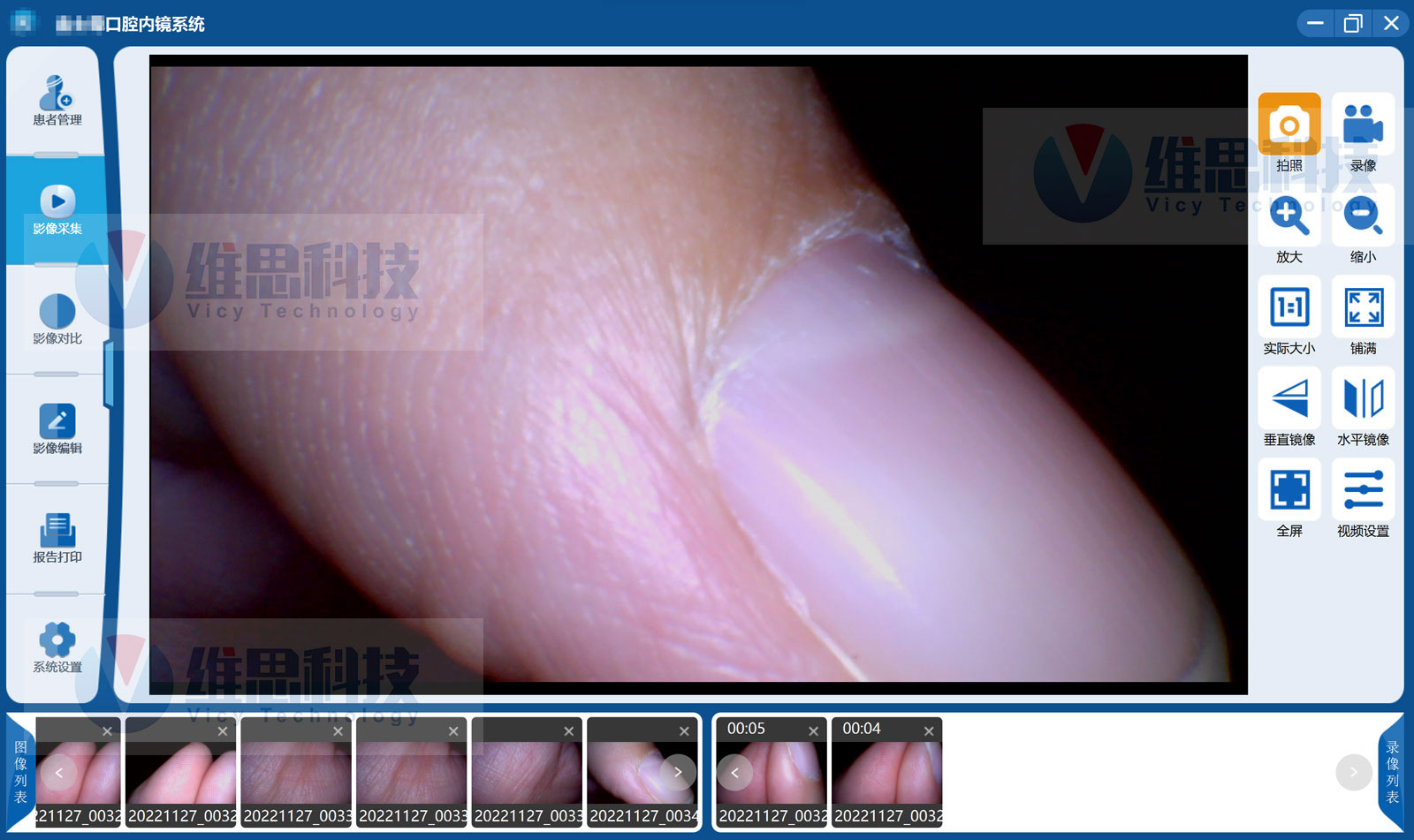 口腔内镜系统,运行在windows平板上,配套USB口腔内窥镜使用。用于口腔检查治疗等,具有病人信息登记管理、图像录像采集、报告编辑、微信分享等功能。